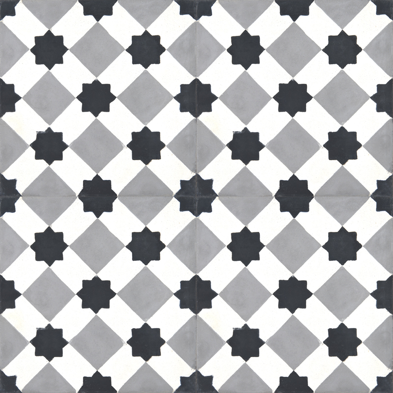 Das zeitlose Design und die klassische Farbkombination (schwarze Sterne, weiße Linien und graue Rechtecke) erleichtern es, diese Fliesen in jeden Stil zu integrieren.
